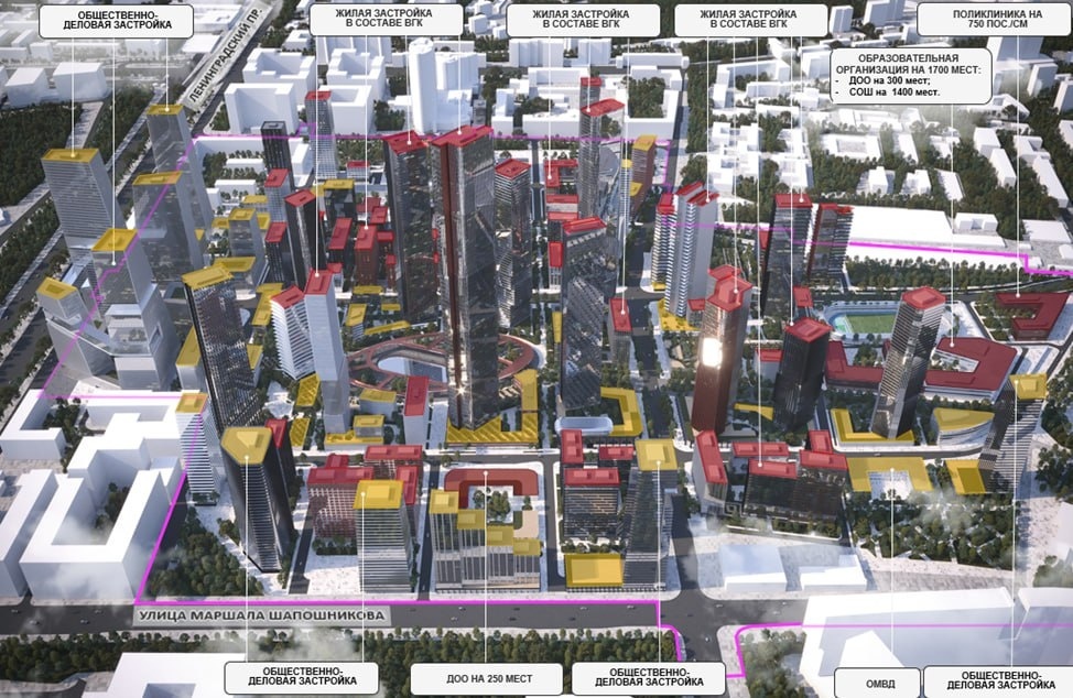 На площадке планируется построить около 2,5 миллионов кв.м. недвижимости, из которых один миллион квадратных метров - это жилые площади, что составит примерно 19 тысяч квартир. Также планируется строительство детских садов и школ, поликлиники и здания отдела МВД. Всё это должно быть передано городу безвозмездно, вместе с квартирами для программы реновации на 30 тысяч квадратных метров.
